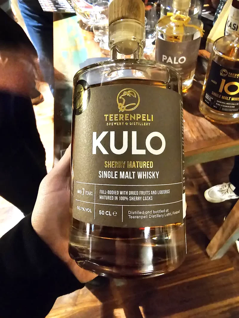 Na festiwalu Whisky Live Warsaw wziąłem się za edycję Teerenpeli KULO (złoty medal 2020, brązowy 2021/2022 i srebrny 2023). Jest to whisky single malt leżakowana 7 lat w beczkach po sherry, dla której bazą jest lekko torfowy new make. Została zabutelkowana z mocą 50,7% i jest sprzedawana w butelce o pojemności 0,5L (EU) oraz 0,7L (US). Zakupiłem również sampelka, bo tej butelki w sklepie festiwalowym niestety nie było, a szkoda.
