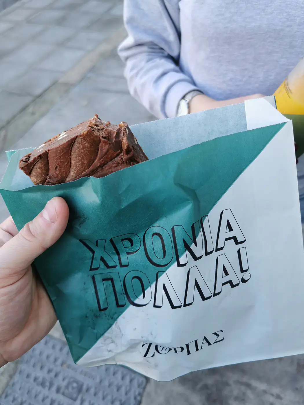 Nie byliśmy głodni, ale na horyzoncie zobaczyliśmy kolejny oddział wspomnianej wcześniej Zorbas Bakery. Oczywiście weszliśmy, żeby kupić lody, ale okazało się że nie ma w kulkach i….wyszliśmy z ciastkiem z Karobu. Mam nadzieję, że kaloryczność tego ciastka zamykała się w 3 cyfrowej liczbie, ale było warto. W smaku jak przepalany cukier, ale z takim ziołowym posmakiem i lekką goryczką.