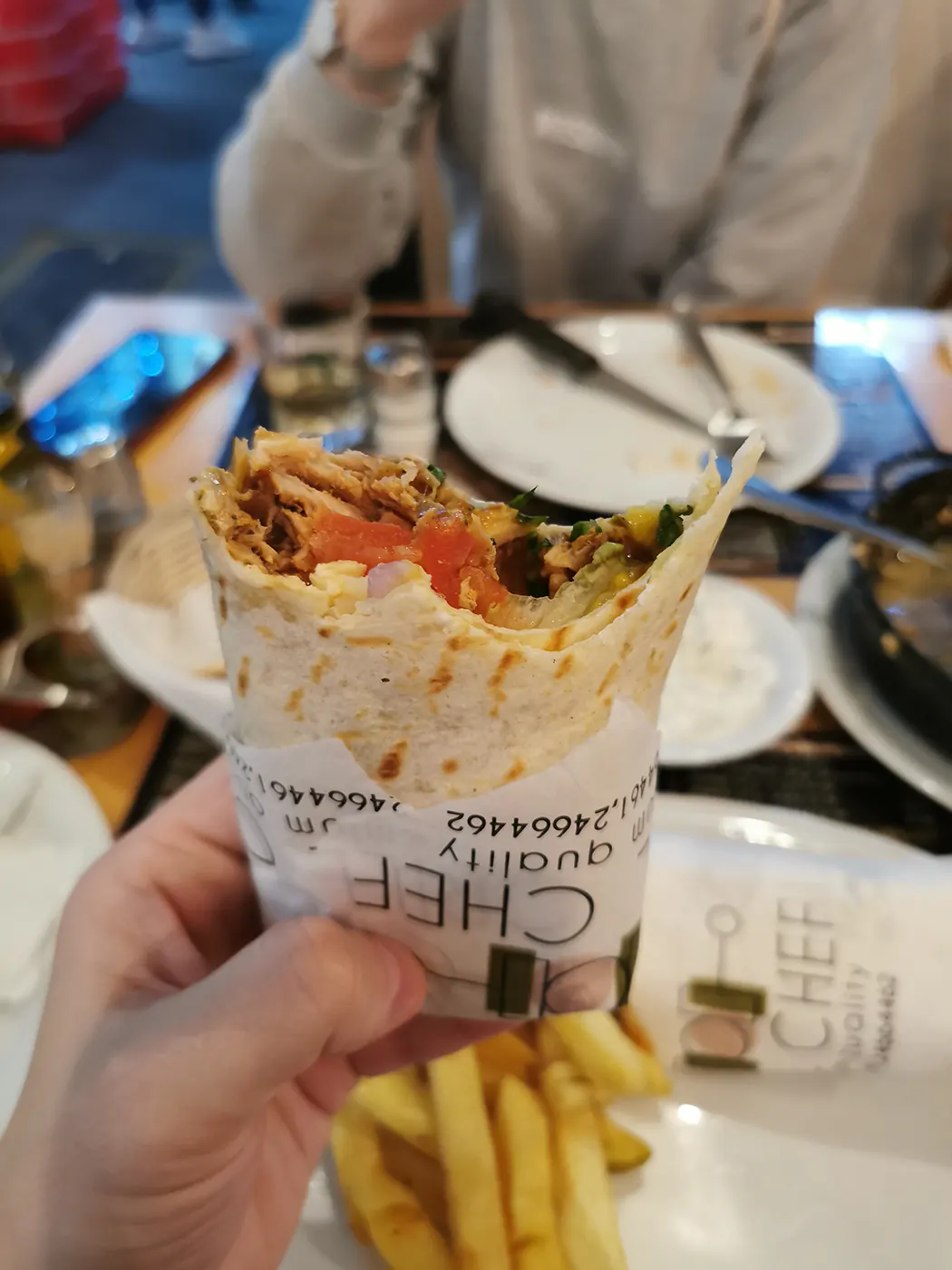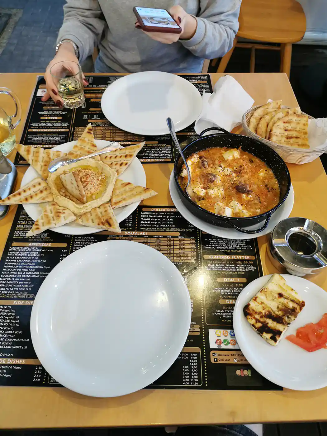 Po całym dniu spędzonym na spacerze i zaledwie jednym bloku czekoladowym na pół, potrzebowaliśmy solidnej kolacji. Zazwyczaj szukamy lokali po ocenie w Google i tak też było tym razem. Po sprawdzeniu wzrokowym 3 miejsc zdecydowaliśmy się na ostatnie z nich o nazwie Grill Chef i to był świetny wybór. Przystępne cenowo i dobre jedzenie zarówno wegetariańskie jak i mięsne. Można się solidnie najeść za przystępny pieniądz. Za 1,5L wina (trochę tam siedzieliśmy, serio – :D), pyszną miseczkę fety w pomidorach na ciepło, hummus z pitami, halloumi, 2 donery, dodatkową pitę i sos Tzatzyki zapłaciliśmy 32€. Gdybyśmy wiedzieli, że przystawki są takie duże, to byśmy tak nie szaleli 😉 Równie dobrze można było zjeść za 12-15€ i też byśmy się najedli, ale chcieliśmy popróbować i było warto. Oceńcie sami.
