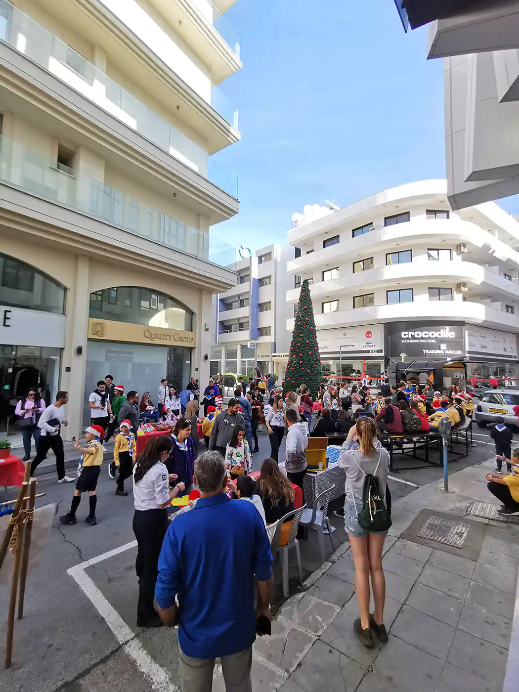 Po tym kalorycznym deserze poszliśmy w kierunku greckiej części. Po chwili byliśmy już na Ledra street przy punkcie kontroli paszportów po tureckiej stronie. Przeszliśmy na część grecką w kierunku centrum i zaczęliśmy myśleć o meczu finałowym mistrzostw w Katarze, który tego dnia miał się odbyć. Po chwili udało nam się znaleźć lokal D’avilla z fajnymi kanapami, piwem, shishą i meczem – tam spędziliśmy pozostały czas w Nikozji. Jak wiecie mecz trwał dosyć długo, bo była dogrywka i emocjonujące karne, więc ostatecznie poszliśmy na autobus po meczu. Do Larnaki odjchaliśmy w okolicach 20:30. W drodze powrotnej na dworzec udało nam się jeszcze przejść po placu obok dworca, na którym wystawiona była miejska choinka.