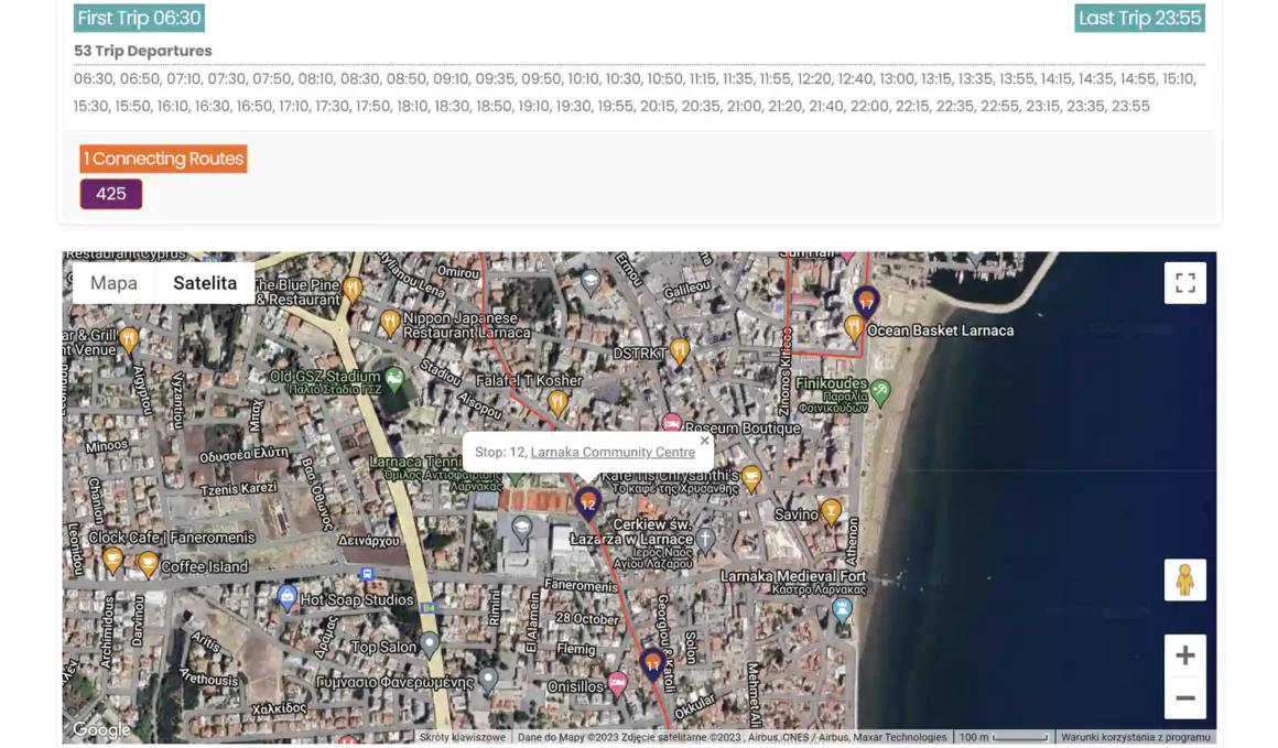 Na przystanku był też czytelny rozkład po angielsku z wszystkimi autobusami jakie stamtąd odjeżdżają. Wrzucam Wam link lokalnych autobusów, czyli Larnaca Public Transport. Po kliknięciu na drugą trasę autobusu numer 425 znajdziecie mapkę jak jedzie i gdzie się zatrzymuje.
