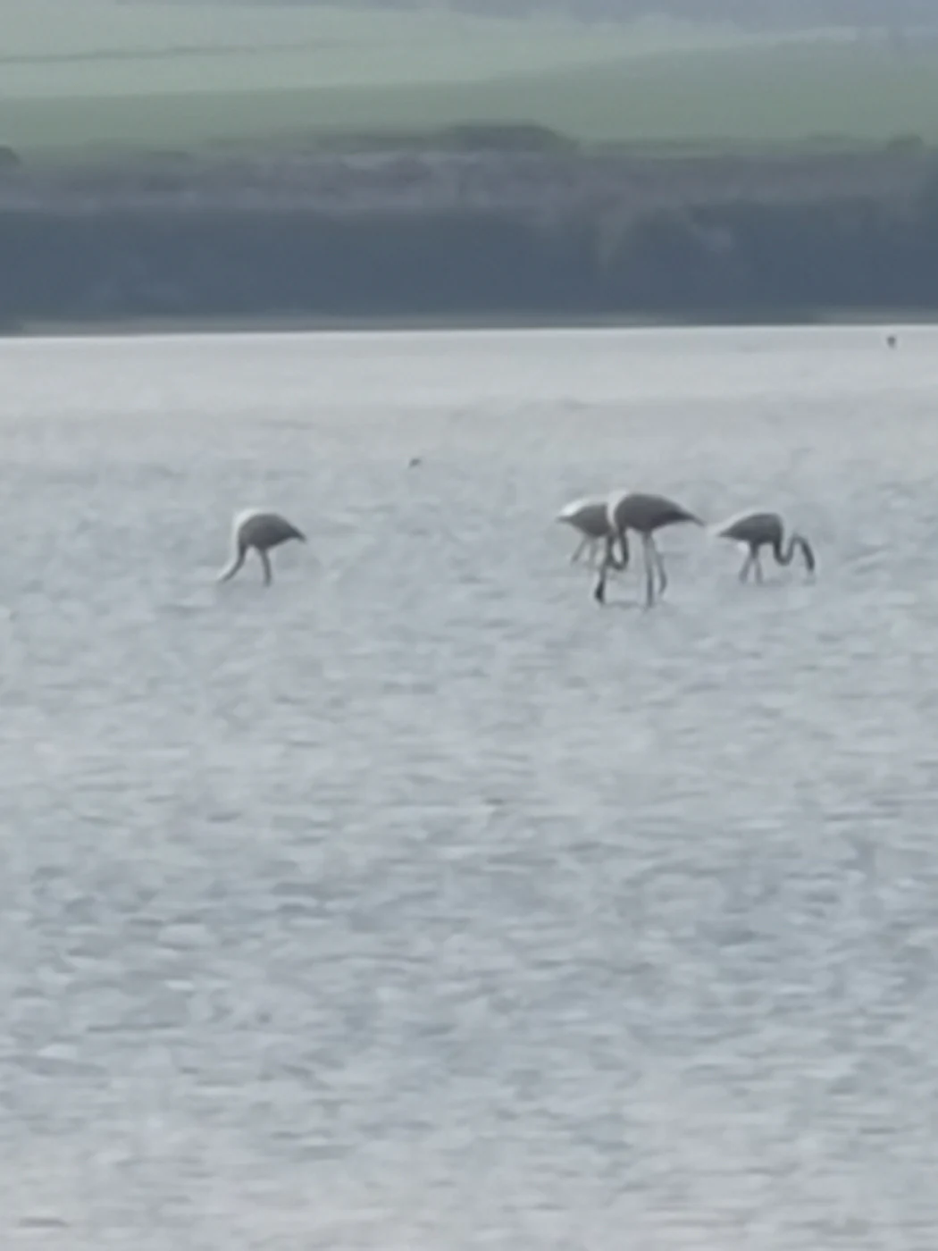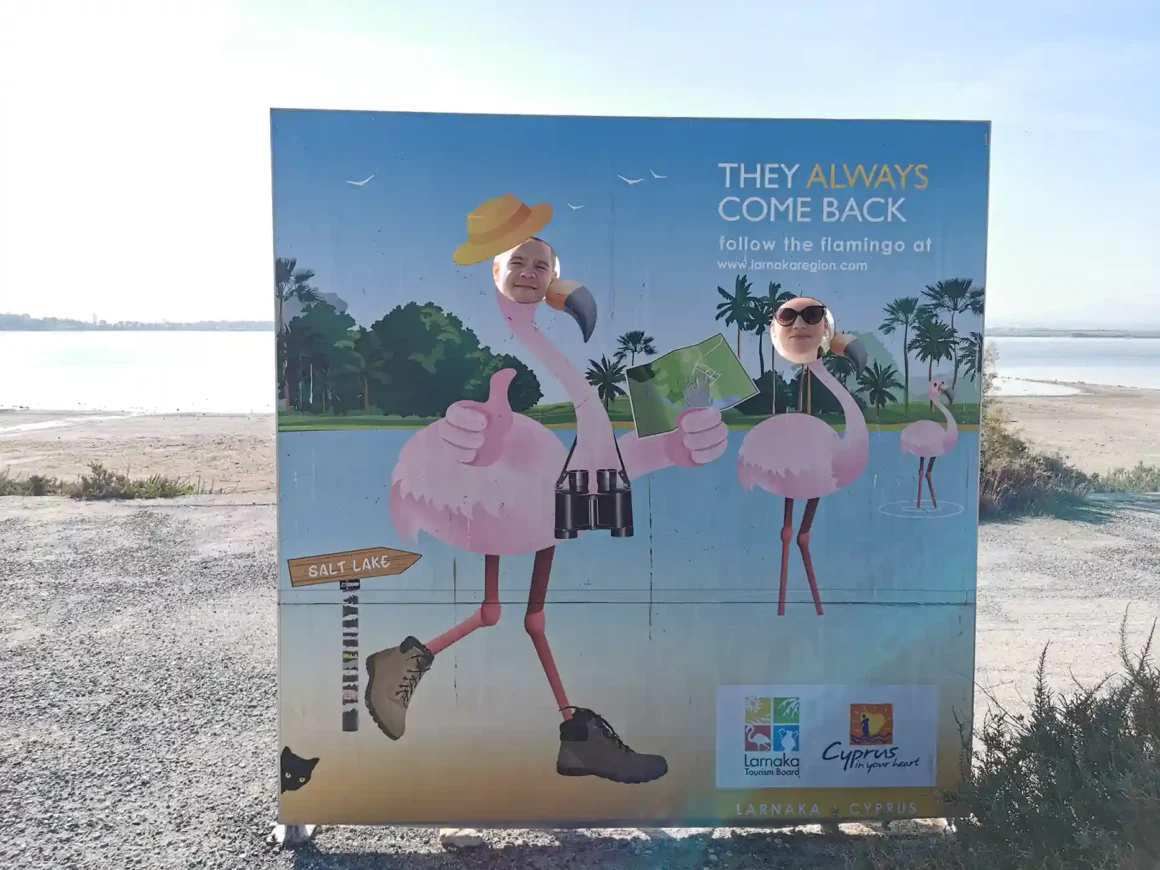 Przeszliśmy wzdłuż brzegu, do punktu, który był oznaczony jako punkt obserwacyjny różowych flamingów. Chodzenia plażą nie polecam, bo buty mieliśmy oblepione w glinie, przez co ledwie dało się iść. W ogóle jezioro jest zaskakująco płytkie, bo flamingi na nim stoją daleko od brzegu. Myślę, że gdyby chcieć to możnaby do nich dojść. Poza nami spotkaliśmy jeszcze tylko 1 parę odważniaków, którzy szli tym bagnem. Różowych flamingów oczywiście nie było blisko brzegu. Stały w takiej odległości, że widać było tylko czarne punkciki. Mój aparat w telefonie ma zoom x50 i zaraz Wam pokażę jak to wyglądało na maksymalnym zoomie. Dla zawiedzionych turystów, którzy nie zobaczyli różowych flamingów tak jak my, została przygotowana … możliwość zostania parą flamingów 😉