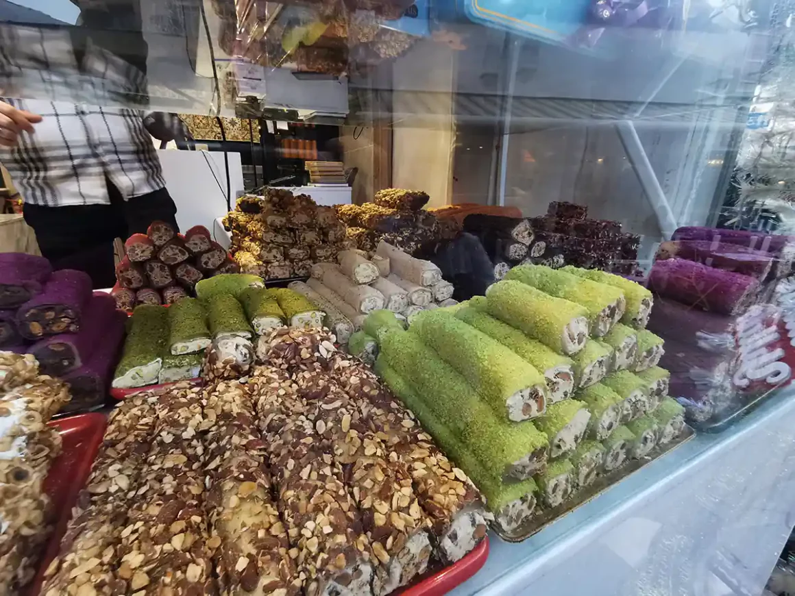 Chwilę później byliśmy już na Ledra Street, gdzie spróbowaliśmy niesamowicie słodkich i tłustych tureckich słodyczy. W zasadzie była to Baklava i tradycyjne Soutzoukos, które możecie zobaczyć poniżej. O ile baklavę większość z nas zna, tak z tradycyjnym soutzoukos, czyli żelką z soku winogronowego z orzechami, spotkałem się pierwszy raz. Nie jest to coś niesamowitego, ale warto na pewno spróbować.