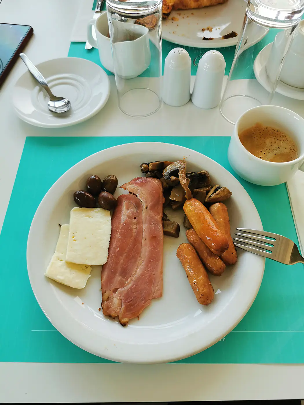 Jeśli chodzi o hotelowe śniadanie było na prawdę niezłe jak na taki hotelik. Było dostępne zarówno standardowe angielskie śniadanie jak i produkty lokalne takie jak sery feta i halloumi. Poza tym były oczywiście ciastka, chleby bananowy i pomarańczowy, opiekacz do chleba oraz kącik francuski ze słodkimi i wytrawnymi rzeczami z ciasta francuskiego. Było też mleko i płatki śniadaniowe, a na zamówienie można było też poprosić o omlet czy jajecznicę. Na prawdę warto wziąć tą opcję. Dodatkowo stołówka zlokalizowana jest 6 piętrze hotelu z widokiem na miasto i morze.