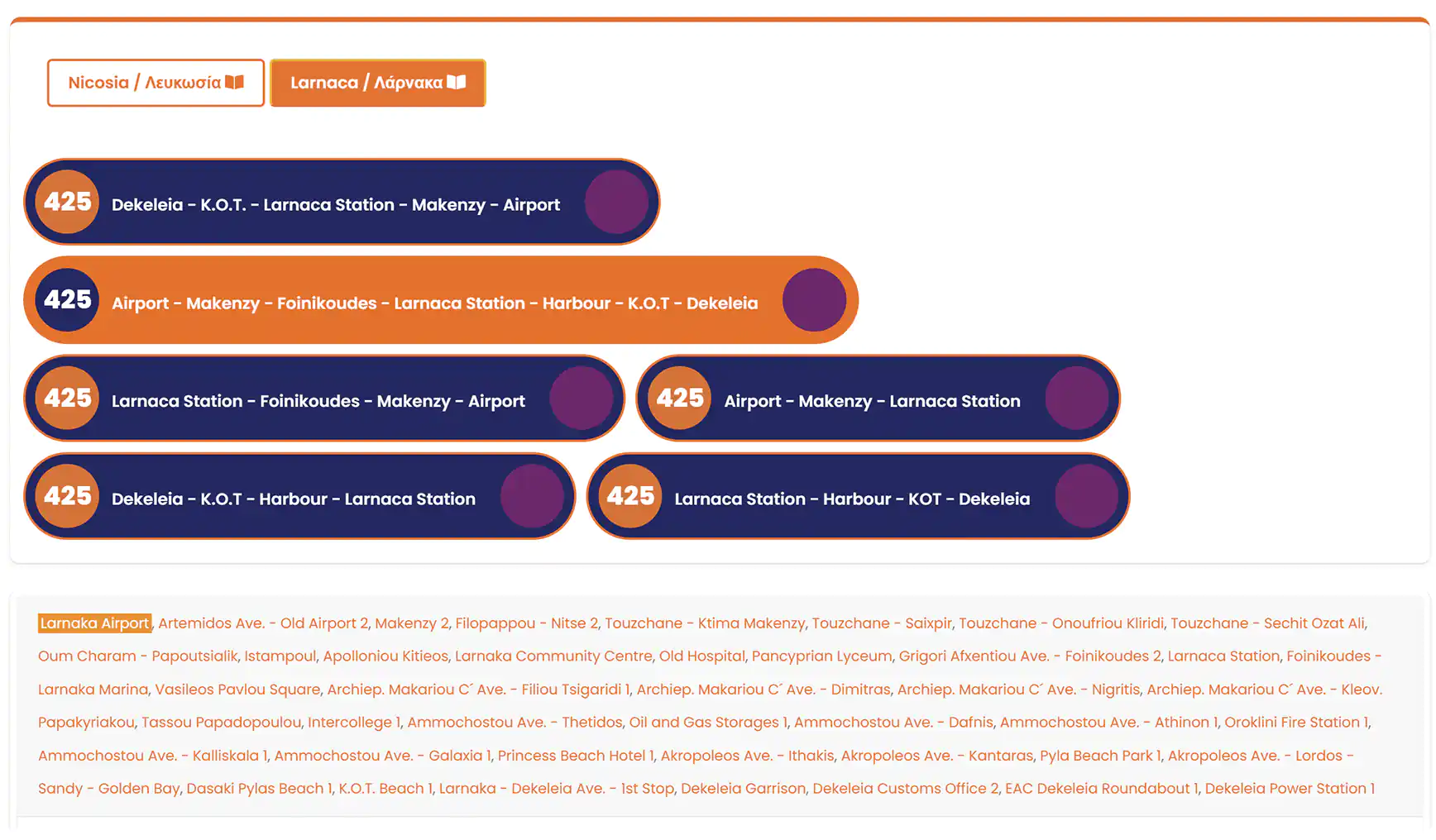Na przystanku był też czytelny rozkład po angielsku z wszystkimi autobusami jakie stamtąd odjeżdżają. Wrzucam Wam link lokalnych autobusów, czyli Larnaca Public Transport. Po kliknięciu na drugą trasę autobusu numer 425 znajdziecie mapkę jak jedzie i gdzie się zatrzymuje.