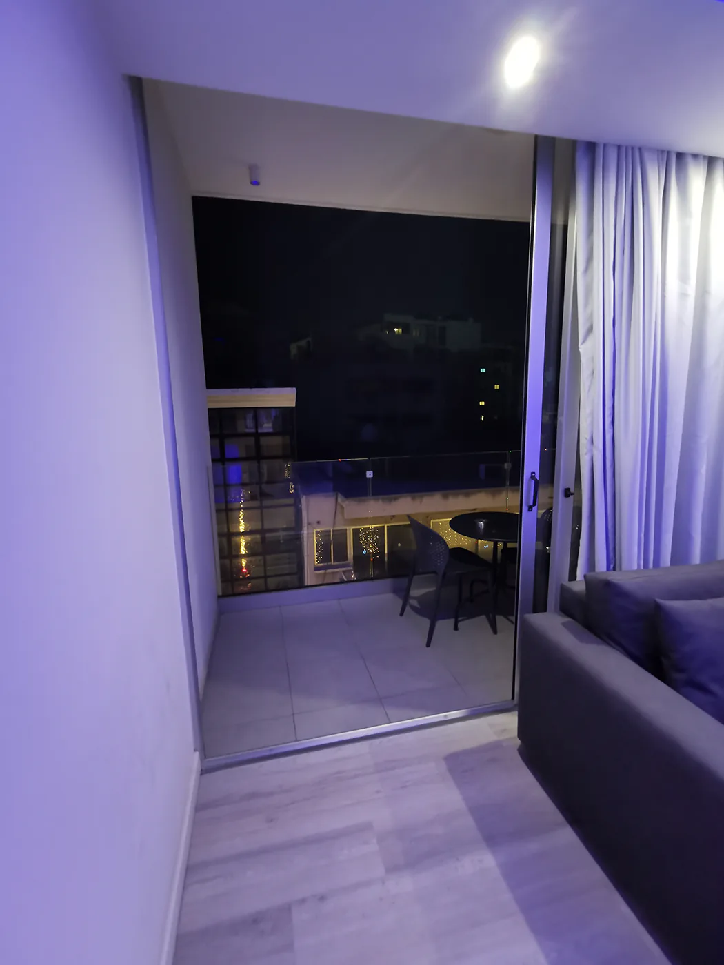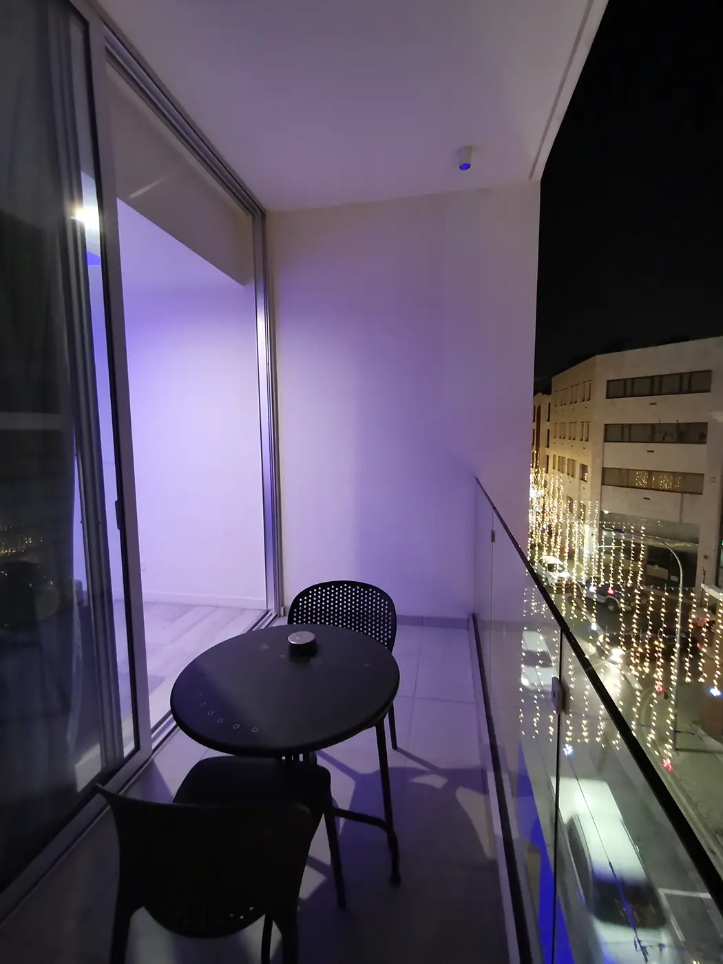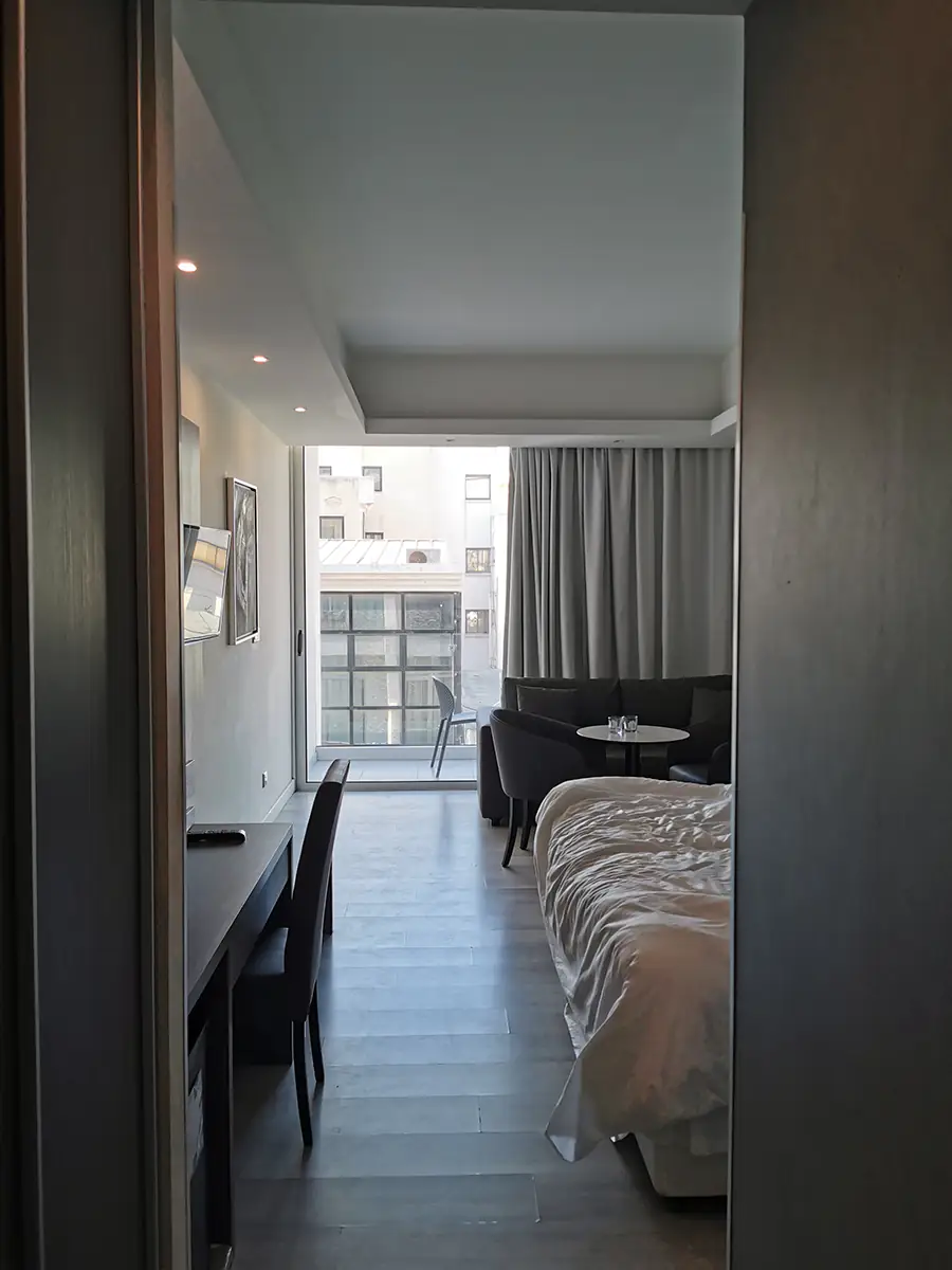 Jak się okazało na miejscu pokój bardzo schludny: łóżko, szafki nocne, mała kanapa i stoliczek, biurko i… rewelacyjne drzwi balkonowe. Podłoga na balkonie jest na tym samym poziomie co w pokoju i to jest zdecydowana zaleta. Po odsunięciu ogromnych drzwi balkon staje się przedłużeniem pokoju. Na balkonie dodatkowo stolik i 2 krzesła, btw. super jest posiedzieć na balkonie w grudniu.