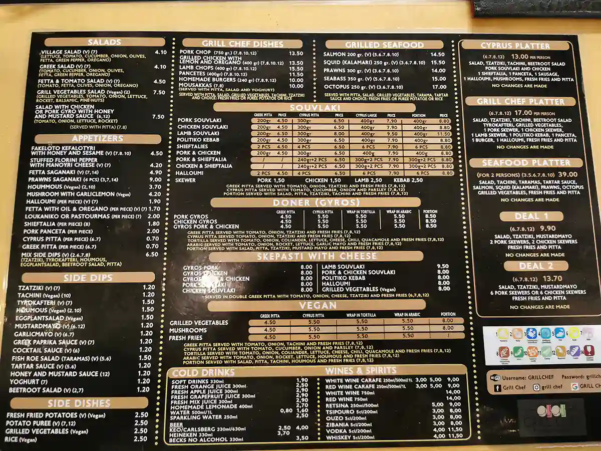 Po całym dniu spędzonym na spacerze i zaledwie jednym bloku czekoladowym na pół, potrzebowaliśmy solidnej kolacji. Zazwyczaj szukamy lokali po ocenie w Google i tak też było tym razem. Po sprawdzeniu wzrokowym 3 miejsc zdecydowaliśmy się na ostatnie z nich o nazwie Grill Chef i to był świetny wybór. Przystępne cenowo i dobre jedzenie zarówno wegetariańskie jak i mięsne. Można się solidnie najeść za przystępny pieniądz. Za 1,5L wina (trochę tam siedzieliśmy, serio – :D), pyszną miseczkę fety w pomidorach na ciepło, hummus z pitami, halloumi, 2 donery, dodatkową pitę i sos Tzatzyki zapłaciliśmy 32€. Gdybyśmy wiedzieli, że przystawki są takie duże, to byśmy tak nie szaleli 😉 Równie dobrze można było zjeść za 12-15€ i też byśmy się najedli, ale chcieliśmy popróbować i było warto. Oceńcie sami.