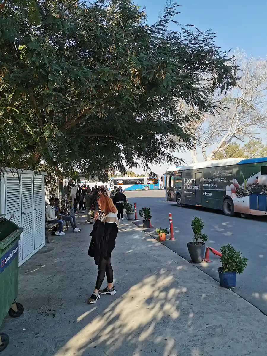 Zaraz po przylocie weszliśmy na górny poziom hali, ponieważ tak pokazywały oznaczenia. Tam można było przejść do przystanku, gdzie stał autobus nr 425. Zapytaliśmy czy jedzie do Larnaki, kierowca powiedział, że tak, więc zapłaciliśmy 3,5€ za osobę (taryfa nocna) i po kilku minutach ruszył.