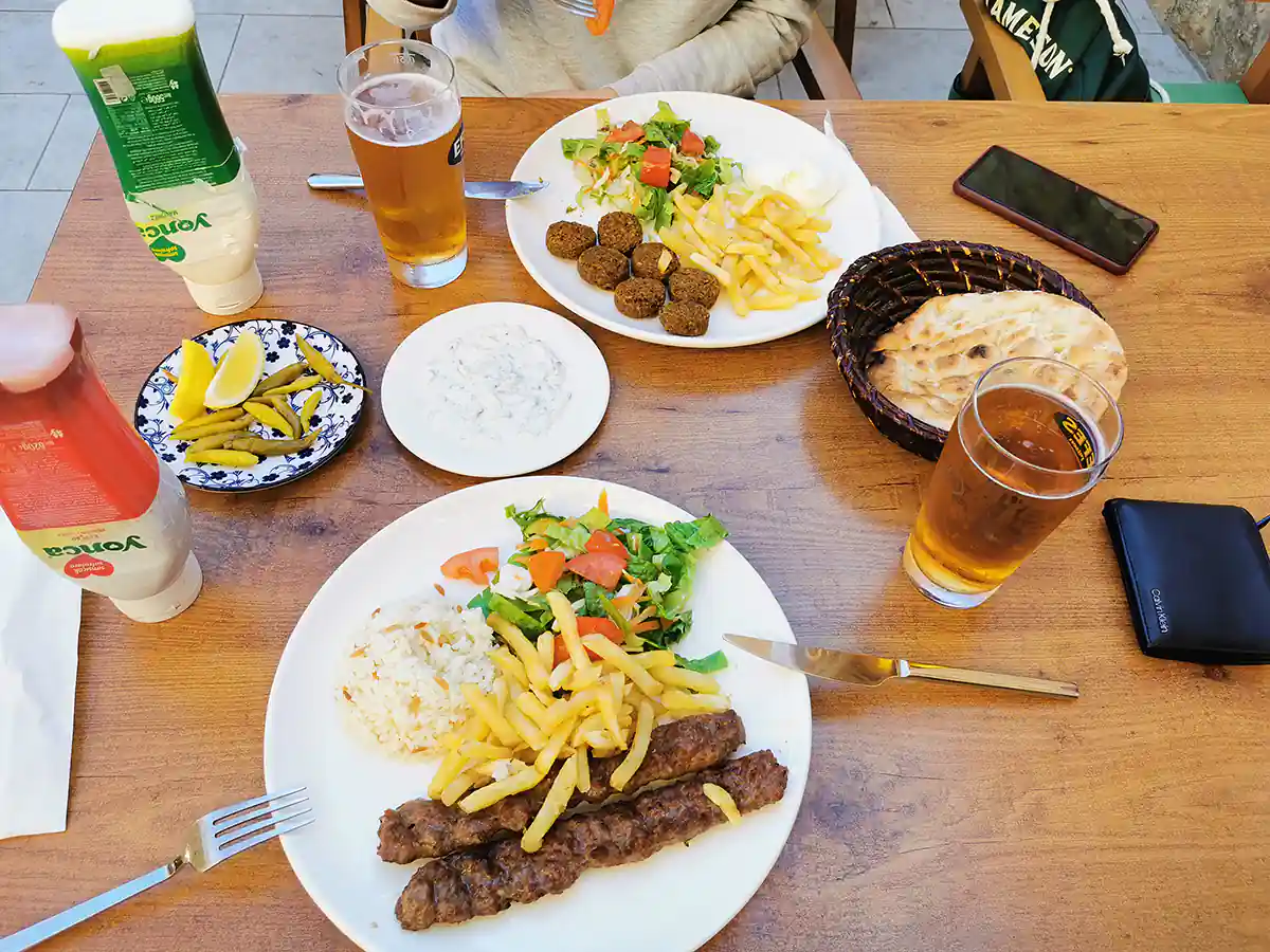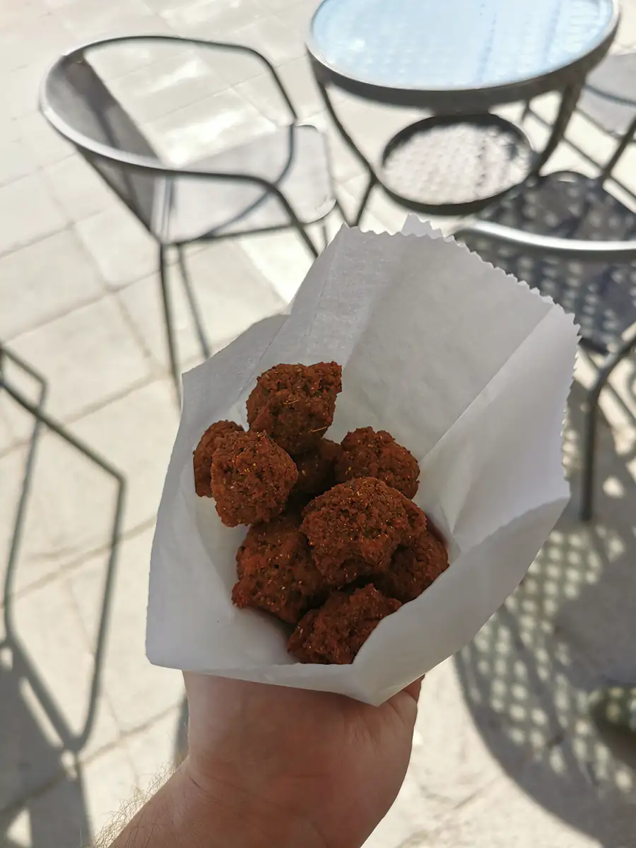 Następna w kolejności była knajpka Falafel Abu Dany ze średnią 4.7 i magiczne danie „falafel popcorn”. Ciekawa postać falafela – chyba z 12 małych kuleczek za ok. 4-5€.