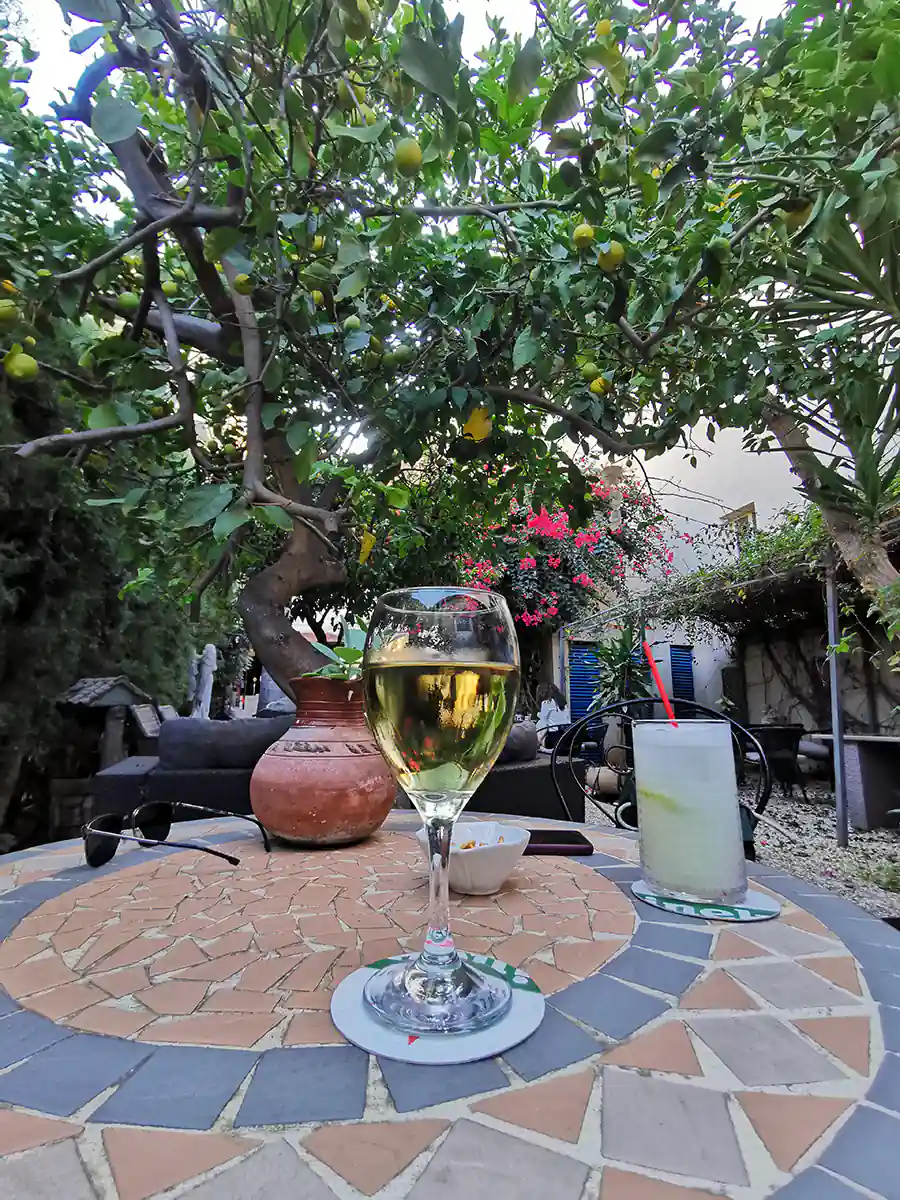 Wróciliśmy do centrum mijając dziwny kościół (lokalizacja). Przechodząca obok starsza Pani powiedziała, że to prywatny kościół, co nas zaciekawiło. Po chwili spaceru znaleźliśmy się w okolicy Cerkwii Św. Łazarza. Zaciekawił nas lokal Secret garden wine and coffee bar, który okazał się pięknym podwórzem z drzewami cytrusowymi, pod którymi stały stoliki. Postanowiliśmy zamówić lemoniadę i lampkę wina. Odchodząc od naszego stolika właściciel zerwał 2 cytryny z drzewa – właśnie w celu przyrządzenia lemoniady! Później porozmawialiśmy z nim trochę i spróbowaliśmy mandarynek z drzewa obok – były na prawdę pyszne.