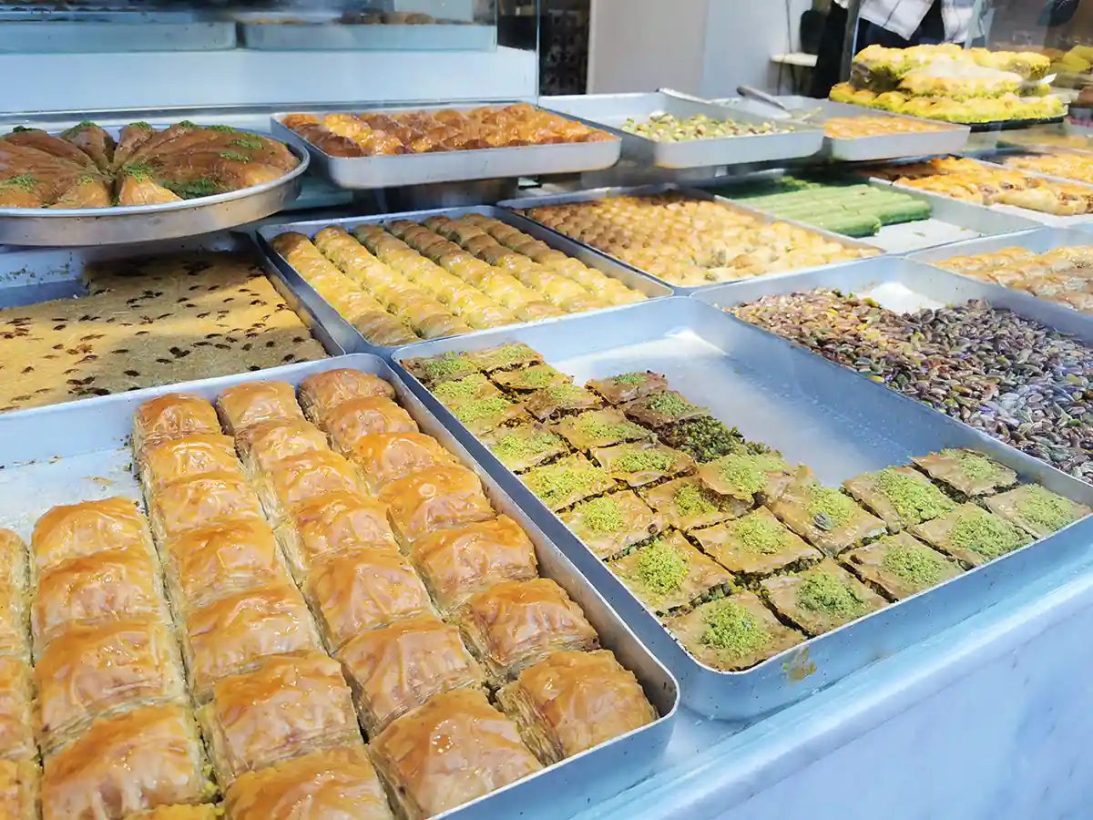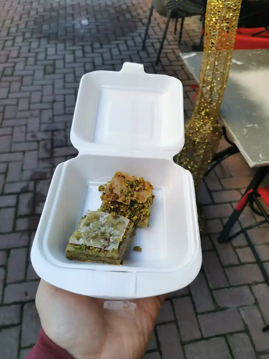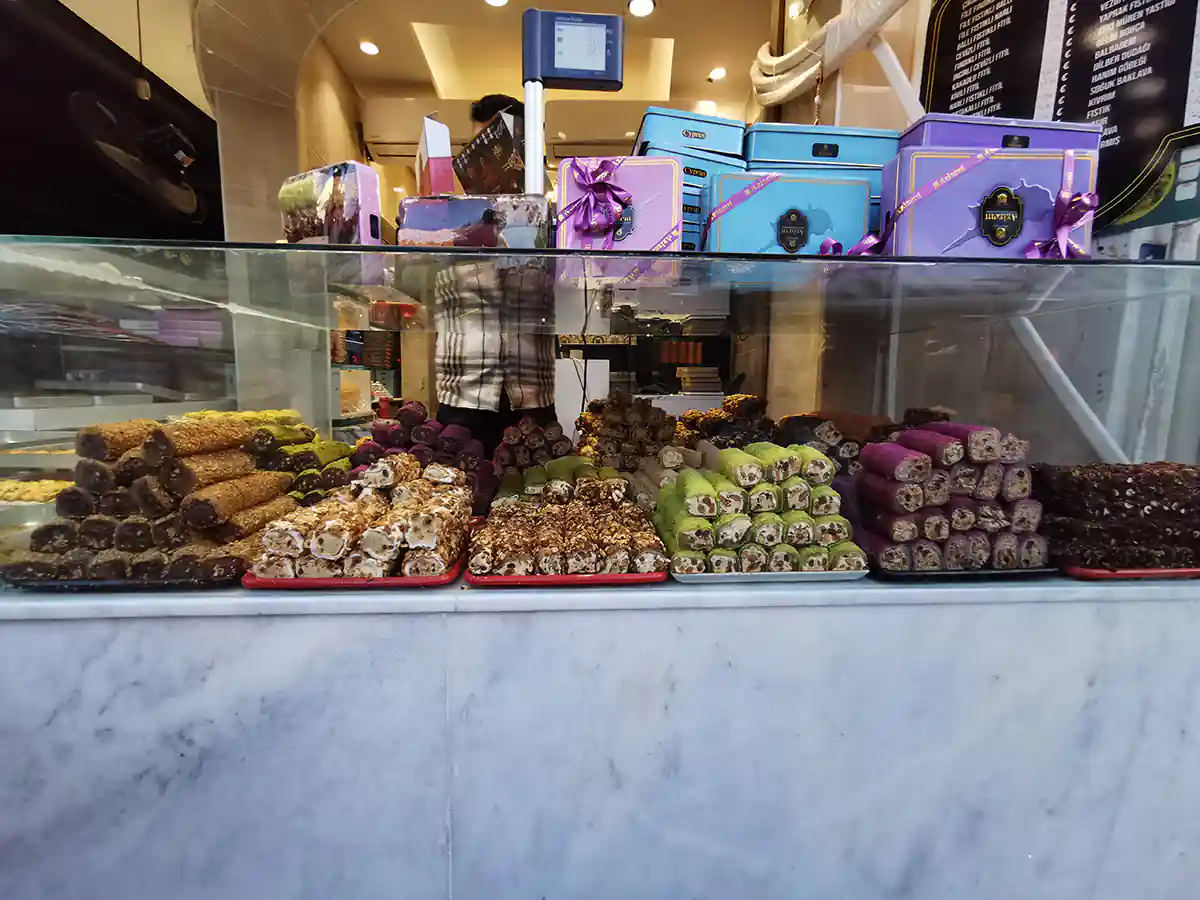 Chwilę później byliśmy już na Ledra Street, gdzie spróbowaliśmy niesamowicie słodkich i tłustych tureckich słodyczy. W zasadzie była to Baklava i tradycyjne Soutzoukos, które możecie zobaczyć poniżej. O ile baklavę większość z nas zna, tak z tradycyjnym soutzoukos, czyli żelką z soku winogronowego z orzechami, spotkałem się pierwszy raz. Nie jest to coś niesamowitego, ale warto na pewno spróbować.