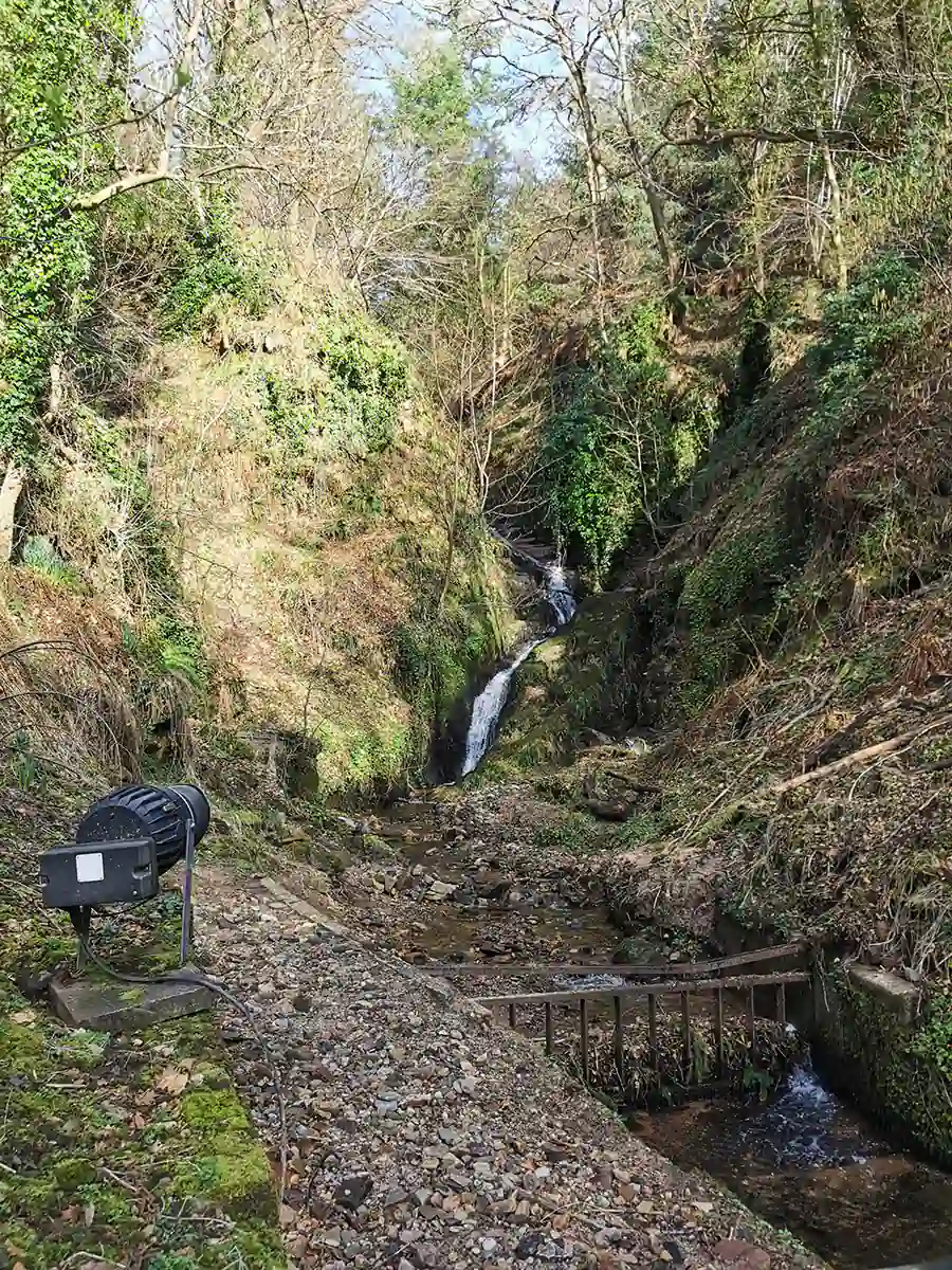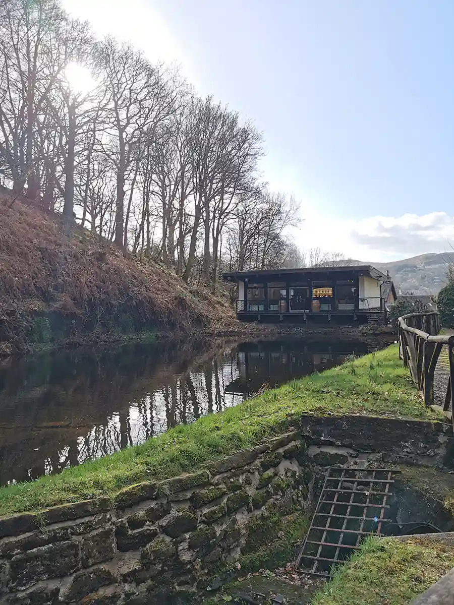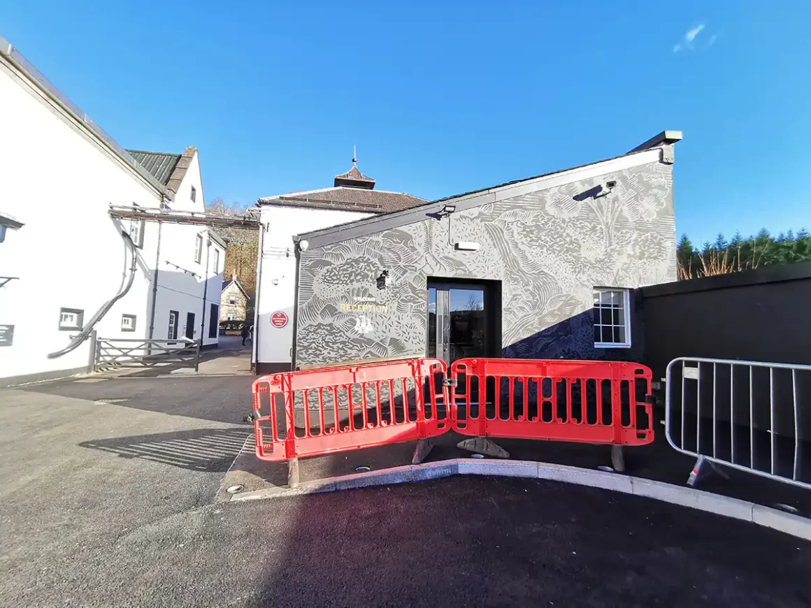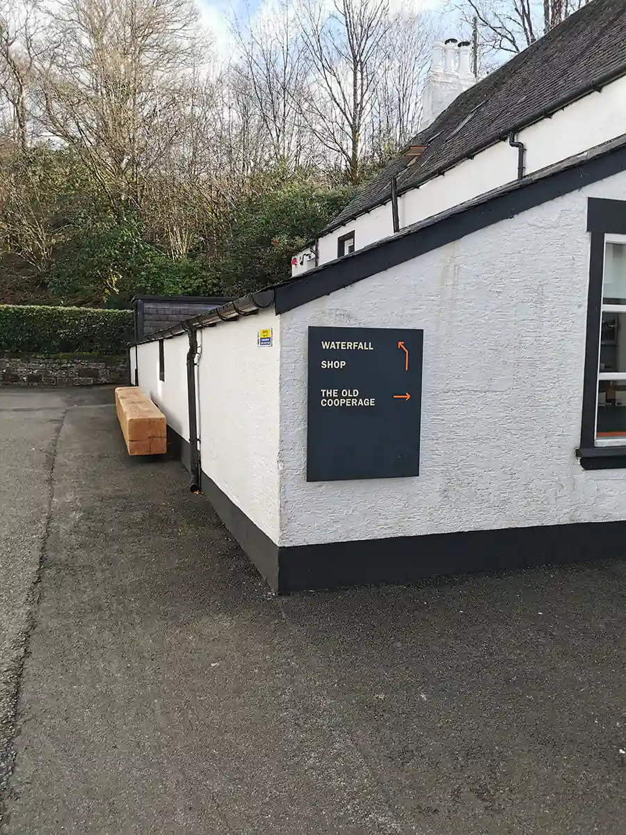 Okolica jest malownicza – polany, wzgórza, strumyk oraz charakterystycznie wyglądający budynek destylarni. Weszliśmy na teren destylarni i tam kazano nam zjawić się 5 minut przed oprowadzaniem w budynku oznaczonym jako The Old Cooperage. Mieliśmy jeszcze 15 minut, więc udaliśmy się do wodospadu, który znajduje się zaraz za budynkami destylarni, a później na dosłownie 5 minut do sklepu zrobić rozeznanie.