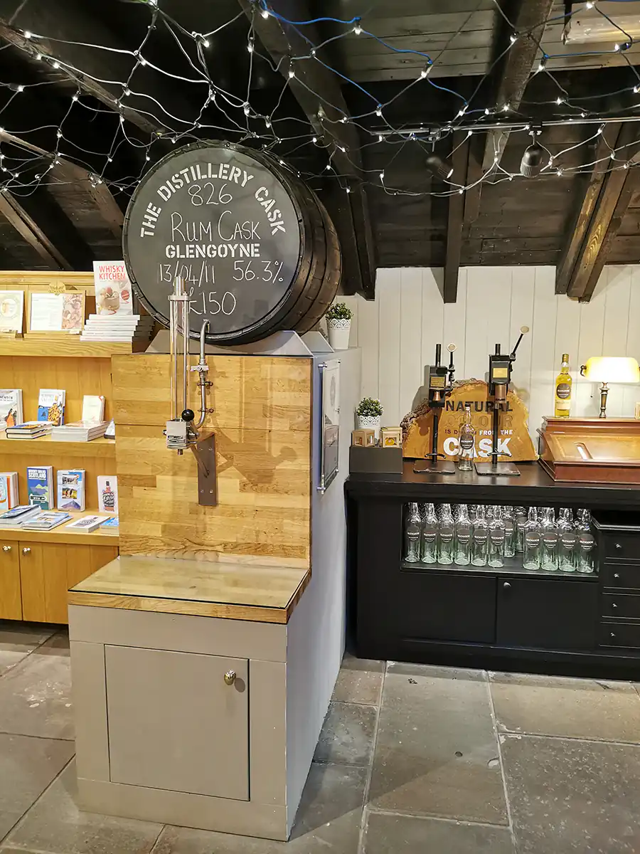 Na miejscu można było również nabyć i samemu nalać do butelki oraz zabutelkować niemalże 12 letnią whisky. Był to single cask leżakowany w beczce po rumie, w formie beczki podłączonej do nalewaka. Whisky ta to tzw. distillery cask i dostępna jest tylko w destylarni a jej koszt to 150 GBP za butelkę.