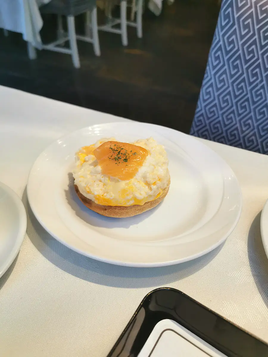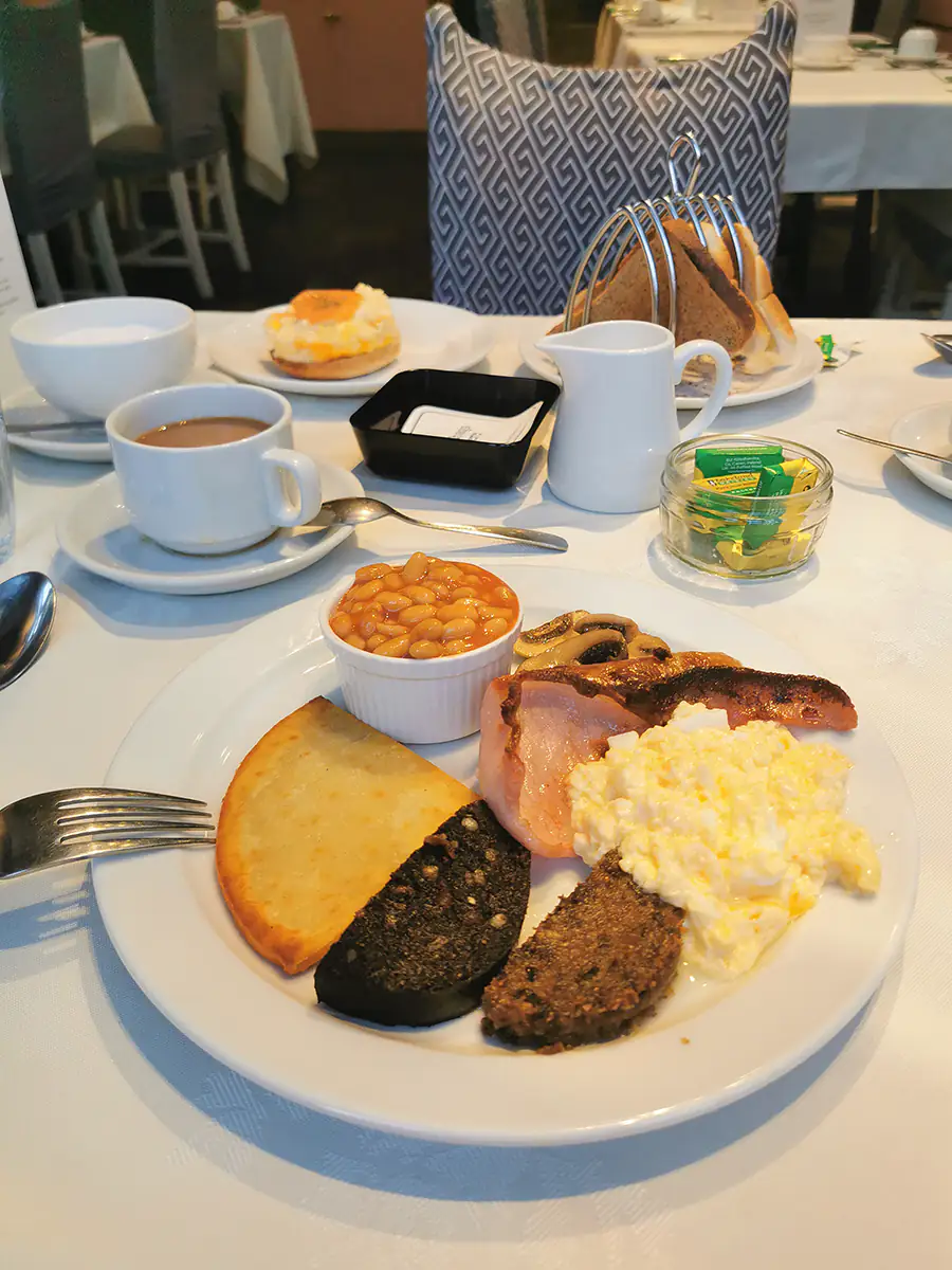 Planując ten dzień spiąłem autobusy tak, żeby zdążyć na degustację, która odbywała się o 13:00 oraz załapać się na zwiedzanie destylarni Glengoyne. Ten dzień wymagał więc odrobiny dyscypliny jeśli chodzi o poranek. Na śniadaniu byliśmy w okolicach 7:30, bo jakoś koło 9:15 z dworca w Edynburgu wyjeżdżał nasz autobus (Citylink) do Glasgow. Tym razem wjechało szkockie śniadanie oraz salmon muffin. O ile to pierwsze oczywiście mnie nie zawiodło, tak salmon muffin okazał się jajecznicą na połówce kajzerki z kawałkiem łososia u góry. Całość była na prawdę dobra, ale chyba spodziewałem się czegoś bardziej spektakularnego.