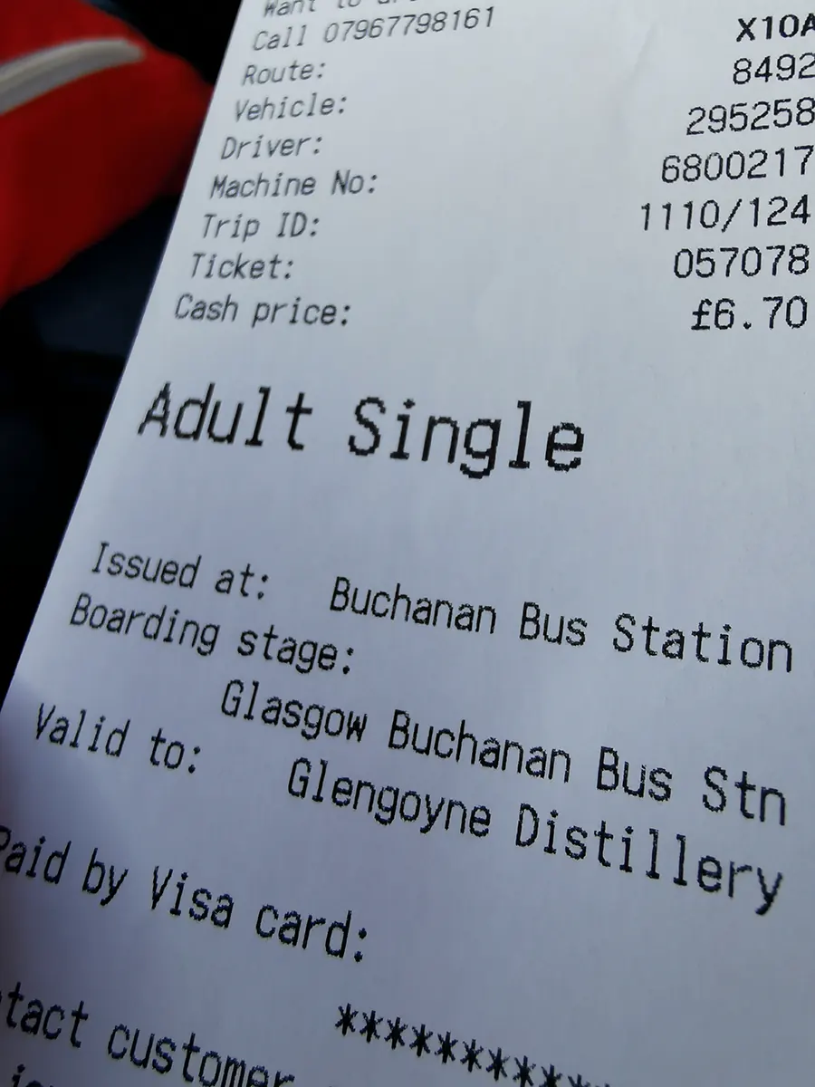Po ponad godzinie jazdy autobusem Citylink nr 900, łączącego Edynburg z Glasgow, kolejny raz wylądowaliśmy na dworcu przy Buchanan Street. Tu czekała nas przesiadka na autobus Midland Bluebird nr X10/X10A. Stojąc w budynku przodem do placu autobusowego należy kierować się w prawo do stanowiska 34. Stamtąd właśnie odjeżdża autobus, który kosztuje 6.70 GBP za osobę w 1 stronę za przejazd do destylarni Glengoyne. Najlepiej mieć gotówkę, ale kartą też można płacić normalnie u kierowcy. Przejazd trwa 60 min, a autobus zatrzymuje się pod samą destylarnią.