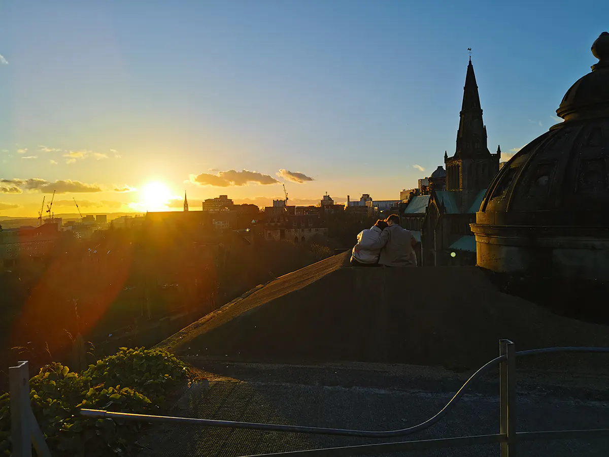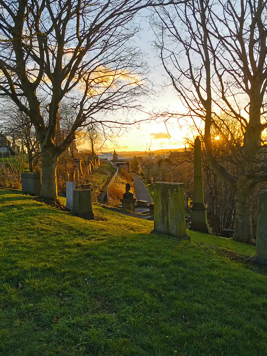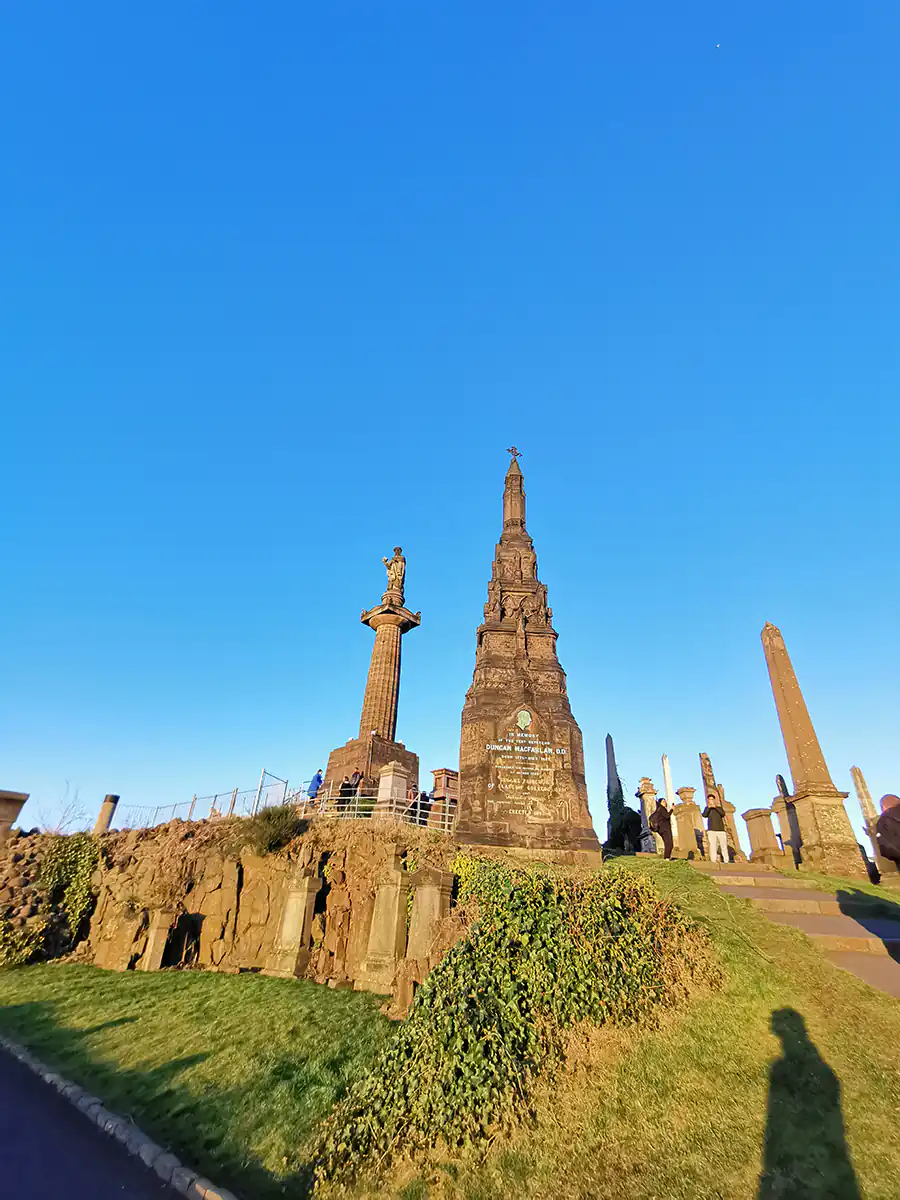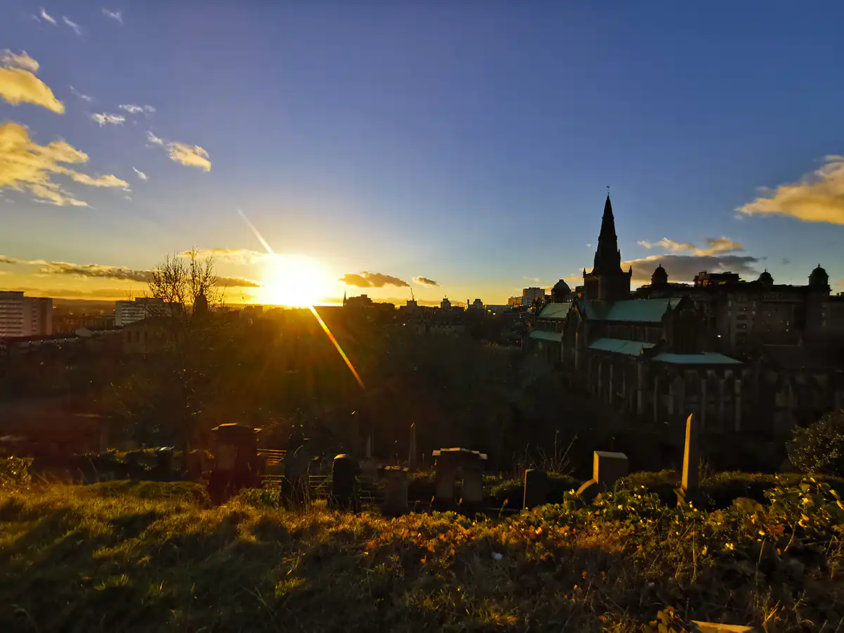 W Glasgow wysiedliśmy na dworcu głównym przy Buchanan Street by udać się w kierunku średniowiecznej katedry św. Mungo oraz cmentarza z grobami znanych mieszkańców miasta. Obydwa miejsca są ulokowane ok. 1,5 km od dworca, więc poszliśmy spacerem. Było już dosyć późno, bo pod katedrę dotarliśmy ok 17:00, więc nie udało nam się do niej wejść. Nie zawsze niestety wszystko uda się zobaczyć. Obawialiśmy się o wejście na cmentarz, bo podobno też jest do 17:00, ale chyba nie są w tej kwestii służbistami, bo spacerowaliśmy tam z godzinę. Trafiliśmy akurat na zachód słońca, więc widoki ze wzgórza były rewelacyjne. Co ciekawe na cmentarzu jest też grób Josepha Gomoszyńskiego, polskiego żołnierza, który emigrował do Anglii. Dał 3 publiczne wykłady o historii Polski, które później spisano.