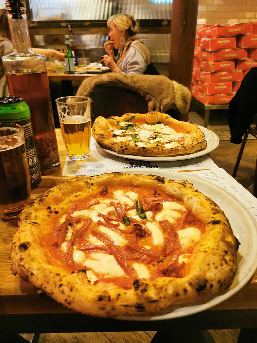 Znaleźliśmy dobrze ocenianą pizzerię o nazwie Paesano Pizza. Jest zlokalizowana bliżej dworca, bo jak wrócimy metrem do centrum to będzie już trochę mniej czasu. Na miejscu trochę się przeraziliśmy, bo była niemała kolejka, a na zegarku 20:15. Po 15 minutach czekania doszliśmy do wejścia. Jak się okazało chwilę później – zostaliśmy „zapisani” do oczekiwania na stolik i odesłani na drugą stronę ulicy. Jednak to chyba największa pizzeria jaką widziałem i Pan, który zarządzał zapisami zapewnił nas, że 15 minut i wejdziemy. Tak też się stało, w środku wszystko poszło sprawnie, do tego mieli nawet przyjemne piwko (Joker IPA). Rewelacyjne włoskie pizze przyszły do nas po może 5-10 minutach oczekiwania – prawdziwa fabryka! Zdecydowanie polecam to miejsce jak chcecie zjeść dobrą pizzę w Glasgow w fajnym lokalu.