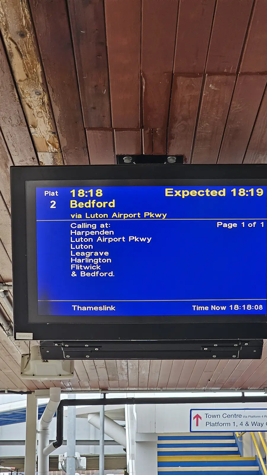 WAŻNE! W Londynie jeździ pociąg za pociągiem, czasem są minutę czy dwie później w tym samym kierunku. Wracając na lotniko Luton, ważne żeby pociąg zatrzymywał się na Luton Airport Pkwy (skrót od Parkway, ale tak się wyświetla czasem). Jeśli skład zatrzymuje się na przystanku Luton, oznacza to że tym pociągiem nie dojedziecie na lotnisko. My właśnie tak zrobiliśmy i wsiedliśmy do pociągu, który nie zatrzymywał się na Luton Airport Parkway, tylko na Luton. W takiej sytuacji trzeba wysiąść w miejscowości St. Albans i poczekać na pociąg zatrzymujacy się na Luton Airport Parkway. Z którego to z kolei wsiadamy z powrotem w pociąg DART i jesteśmy na lotnisku.