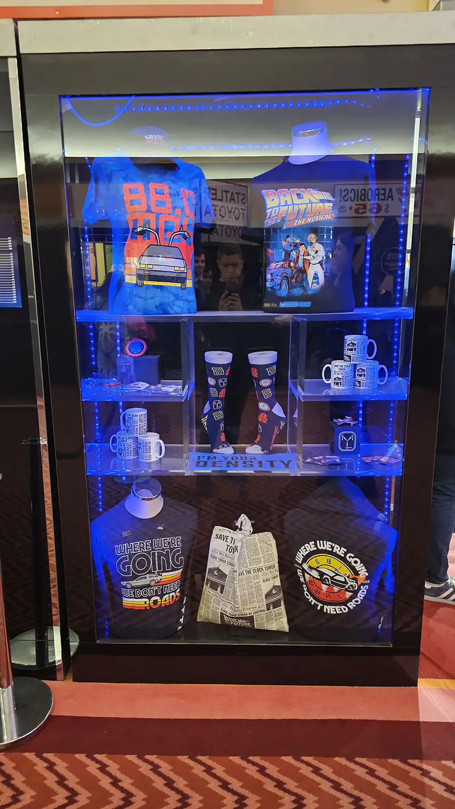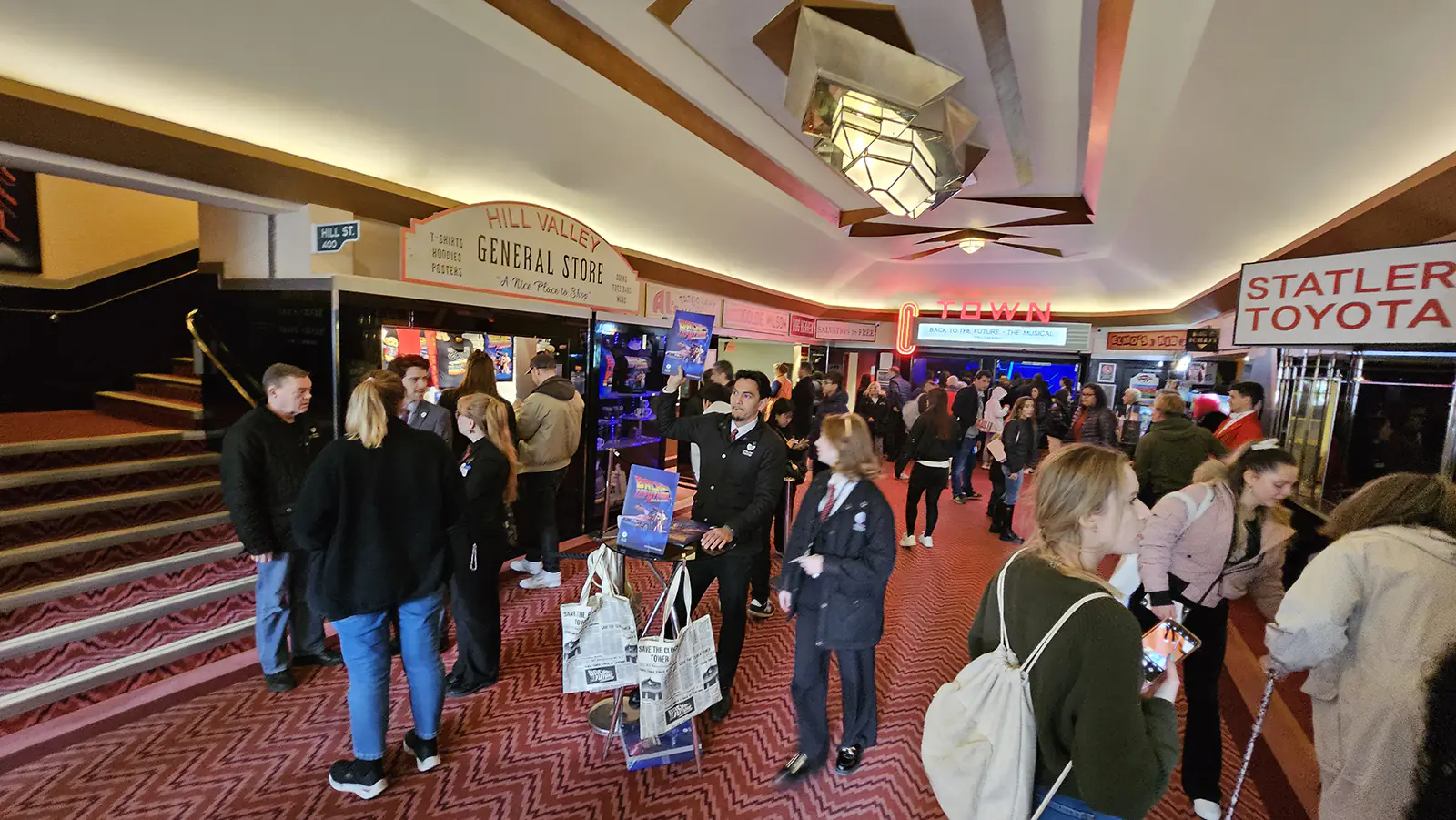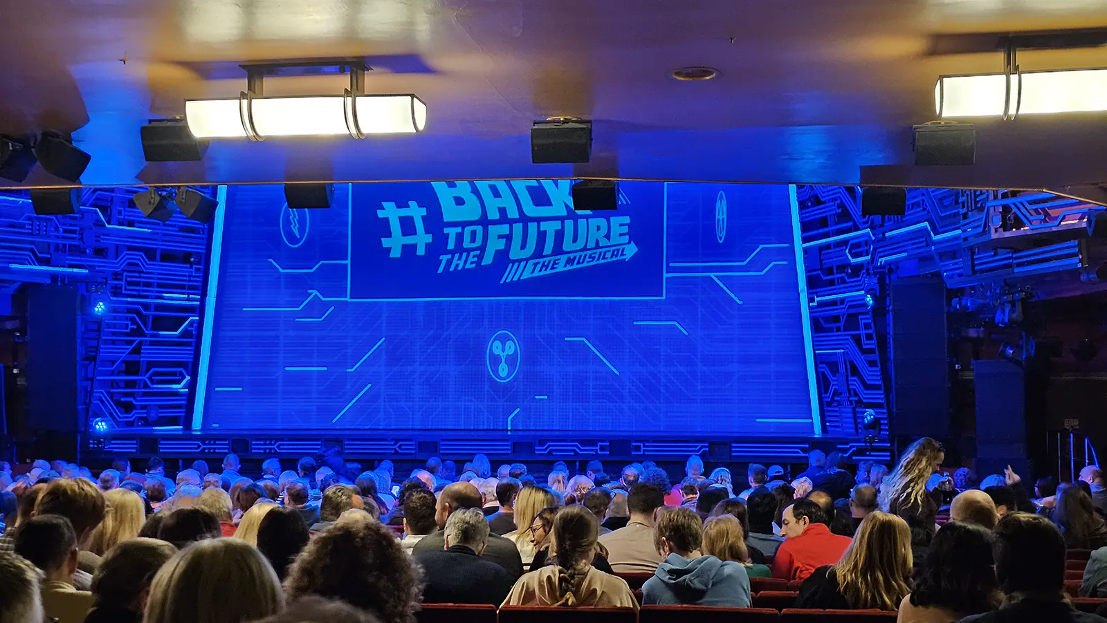 Po chwili spaceru znaleźliśmy się u głównego celu podróży, czyli w teatrze Adelphi, w którym ma odbyć się musical „Back to the future”. Zaraz po wejściu bardzo krótkie lobby z barem i sklepikiem z gadżetami z przedstawienia. Całe miejsce oczywiście stylizowane na miejsca z filmu, a za nim bezpośrednie wejście na salę. Bilety zakupiłem nam na część 'Stals’, miejsca zaraz przy tzw. 'reżyserce’ w rzędzie W. W informacjach przy zakupie była uwaga, że 'reżyserka’ może zasłaniać część sceny, co okazało się nieprawdą. Scena byłą bardzo dobrze widoczna w całości.